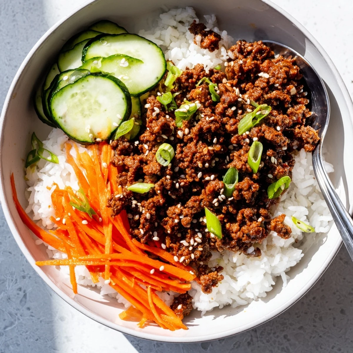These vibrant Korean-inspired bowls combine browned ground beef with a sweet and spicy sauce featuring soy sauce, sesame oil, garlic, ginger, and gochujang. Served over fluffy jasmine rice and topped with crisp julienned carrots, cucumber, scallions, and toasted sesame seeds, this dish delivers perfect balance of savory, sweet, and tangy flavors.