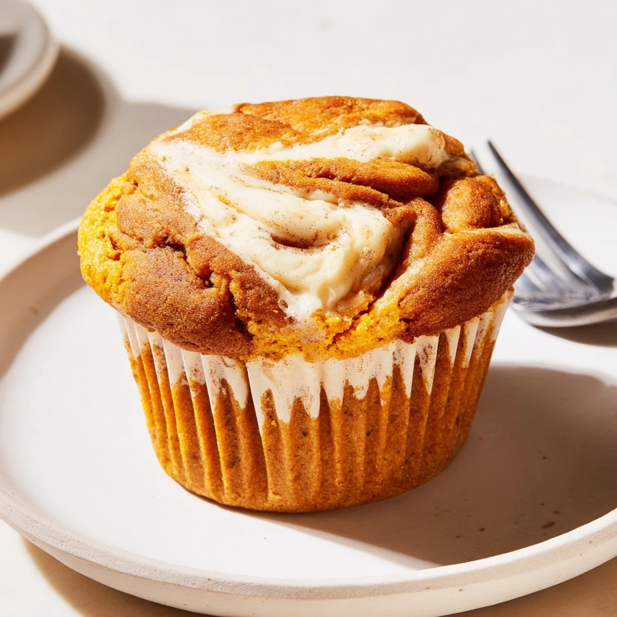 The chai-spiced cheesecake swirl adds a creamy, tangy layer infused with warm spices like cardamom, cinnamon, ginger, cloves, and nutmeg. This creates a rich texture contrast and depth of flavor beyond traditional pumpkin muffins.