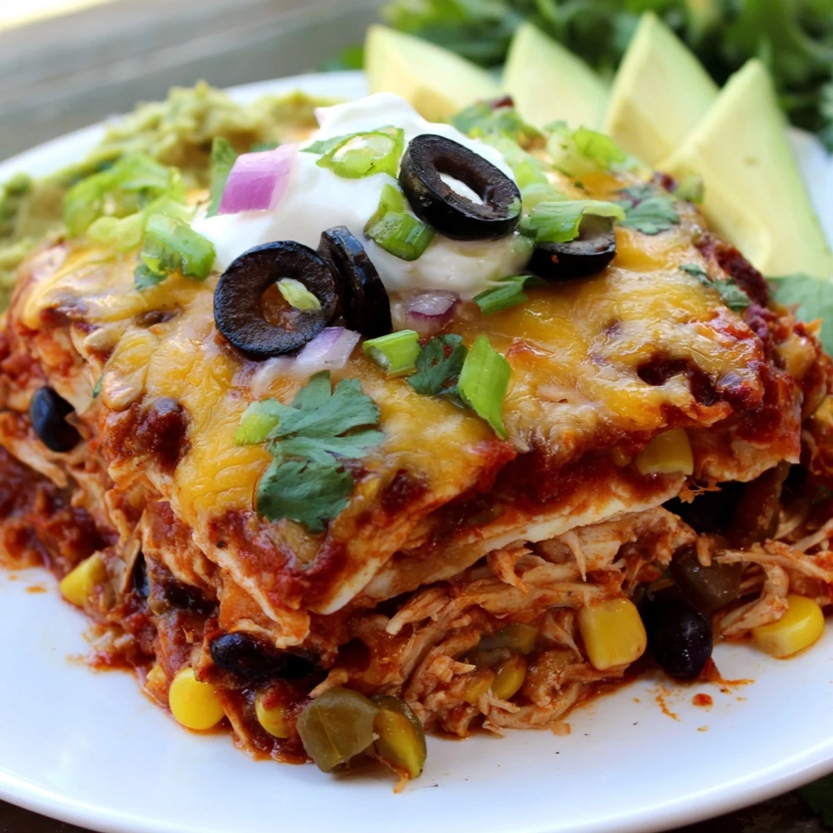 This hearty Tex-Mex casserole brings together layers of tender shredded chicken, black beans, corn, and aromatic spices, all nestled between soft tortillas and smothered in red enchilada sauce. The crowning glory is a generous blanket of shredded Mexican cheese that becomes golden and bubbly after baking. What makes this dish special is how the flavors meld together—the sauce soaks into the tortillas while the cheese creates that irresistible gooey texture everyone loves. Plus, it comes together in just 20 minutes of prep time.