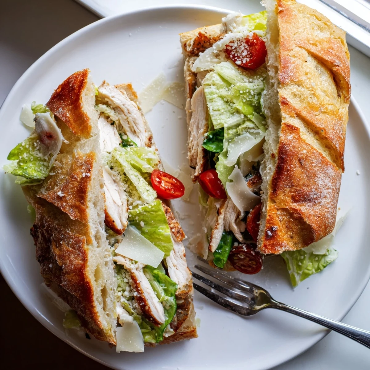 This portable take on the classic Caesar salad features seasoned grilled chicken breasts sliced thinly and layered on butter-toasted ciabatta rolls. The homemade Caesar dressing blends mayonnaise, Parmesan, lemon juice, Dijon mustard, Worcestershire, and garlic for rich, tangy flavor. Crisp shredded romaine, additional shaved Parmesan, and optional cherry tomatoes complete the assembly. The entire preparation comes together in just 30 minutes, making it perfect for quick lunches or casual dinners.