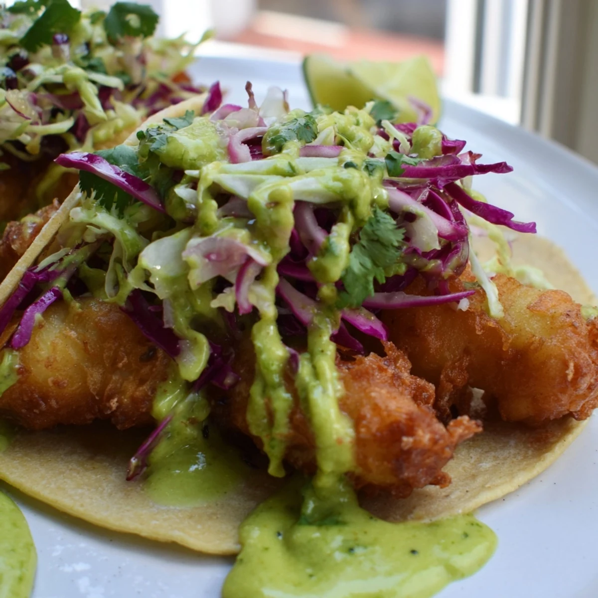 You can prep the slaw and crema up to four hours ahead and keep them refrigerated. The fish batter should be mixed right before frying for the best rise. Keep everything chilled until you are ready to fry.
