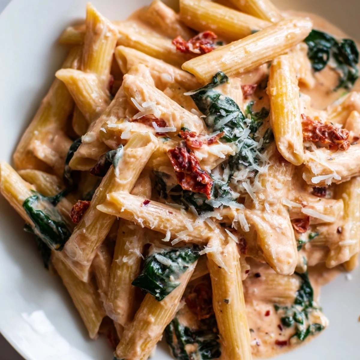 This satisfying one-pan pasta combines sun-dried tomatoes, fresh spinach, and a velvety cream sauce for a rich and comforting meal. The entire dish cooks in a single skillet, meaning the pasta absorbs all the flavors while simmering directly in the broth and cream.