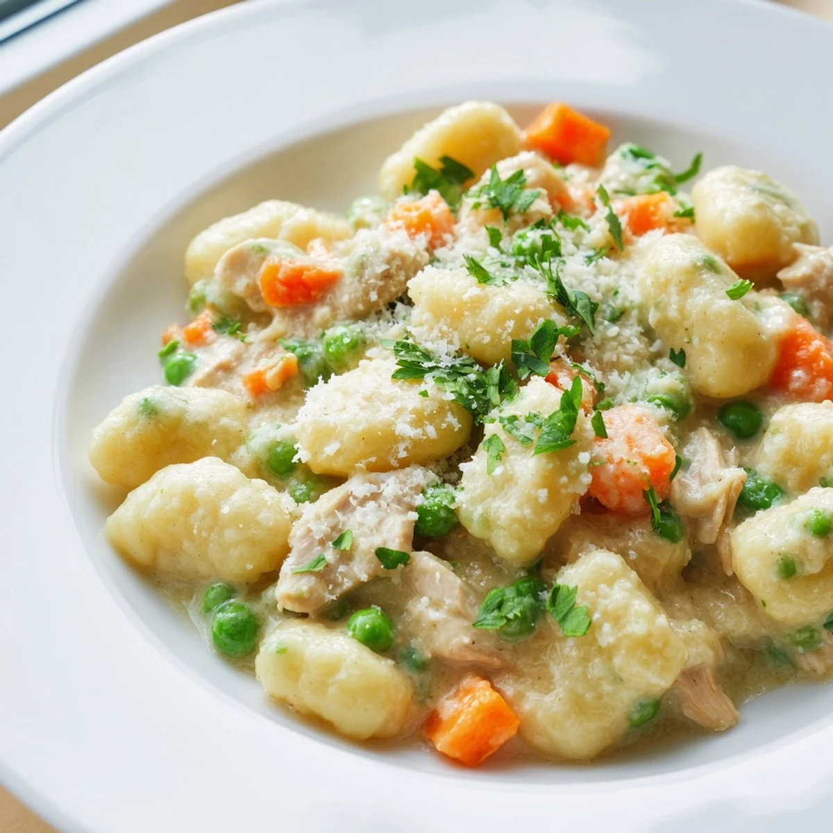 Store-bought gnocchi cooks directly in the sauce, absorbing the savory flavors and becoming pillowy soft. A sprinkle of grated Parmesan adds umami depth, and fresh parsley brightens the finished dish. With only one pot to clean, this hearty meal serves four people and delivers all the comfort of traditional chicken pot pie with half the effort.