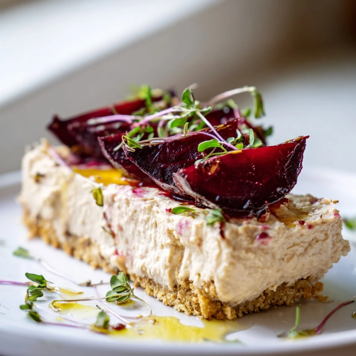 This stunning European-style savoury cheesecake combines creamy cheeses with aromatic thyme and lemon zest, all resting on a buttery wholemeal crumb crust. The sweet, caramelized roasted beetroot creates a beautiful contrast against the rich, velvety filling. Fresh chives and microgreens add brightness, while a final drizzle of extra virgin olive oil brings everything together. Serve chilled or at room temperature for the perfect appetizer that will impress your guests.