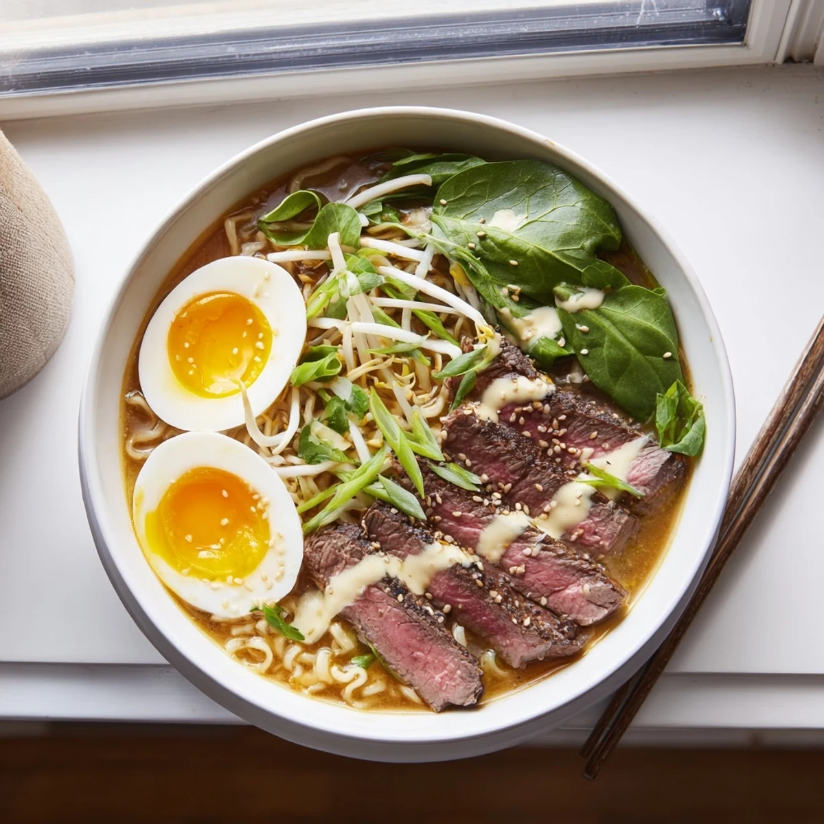 - Boil ramen noodles according to package instructions, then drain and divide them among four bowls. Arrange halved soft-boiled eggs, bean sprouts, spinach, and seared beef on top.
